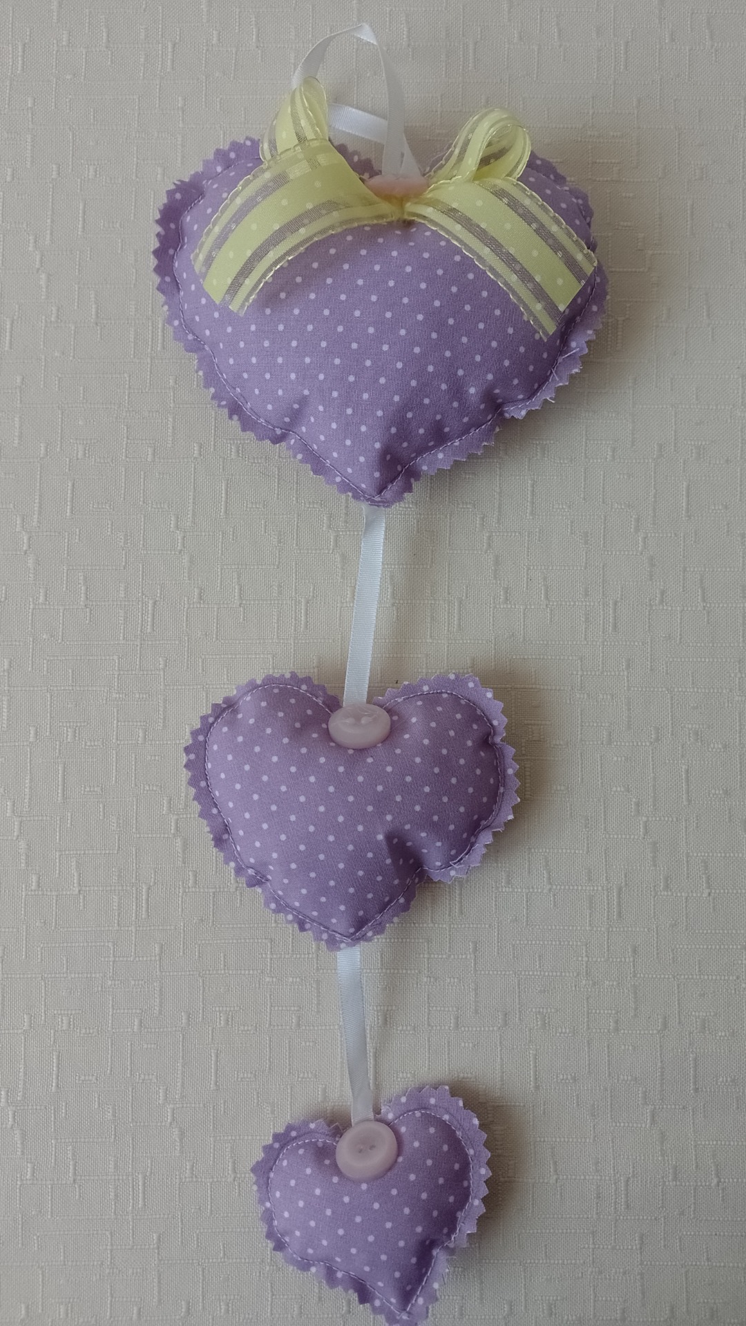 Srdíčka jsou ušita z nové bavlněné látky. Plněna kuličkovým rounem. Zdobena stuhou a knoflíkem.