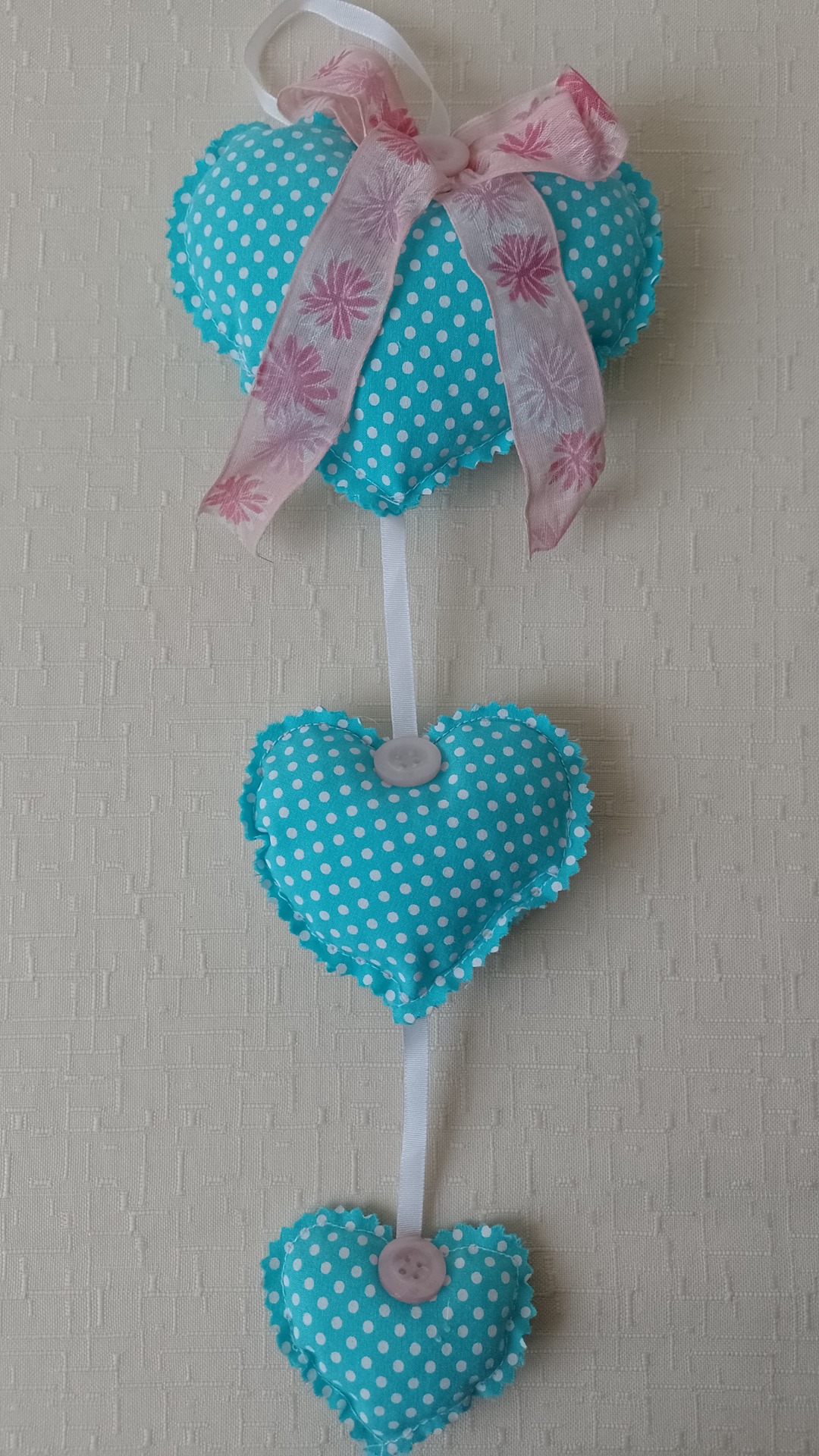 Srdíčka jsou ušita z nové bavlněné látky. Plněna kuličkovým rounem. Zdobena stuhou a knoflíkem.
