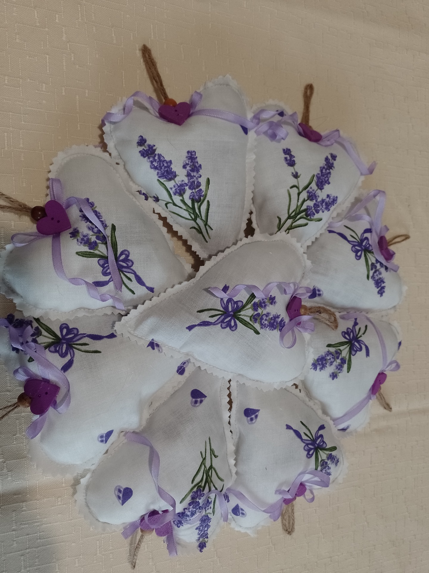 Srdíčko je ušito z bavlněné látky. Plněno ovčím rounem a sušenou levandulí.